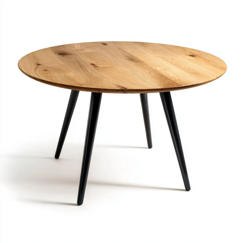 Table de repas ronde en chêne massif avec pieds en acier noir