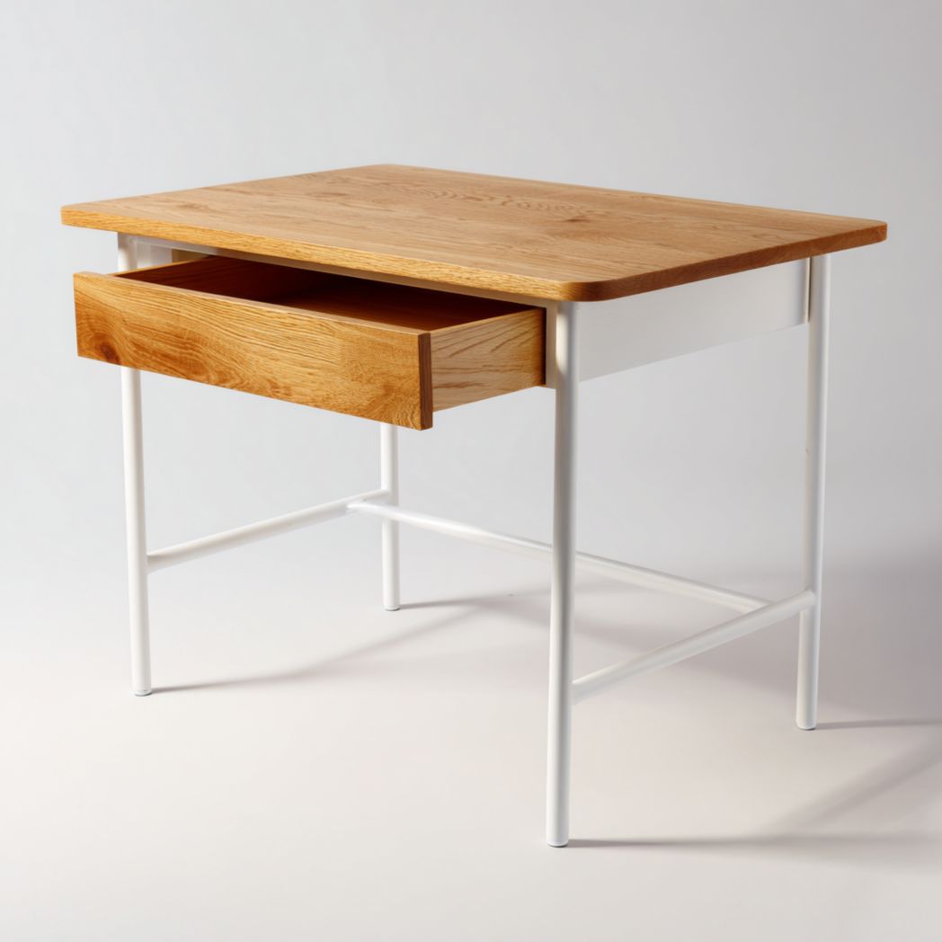 Bureau d'ordinateur avec plateau en bois de chêne massif, un tiroir et structure en acier - Blanc et Chêne
