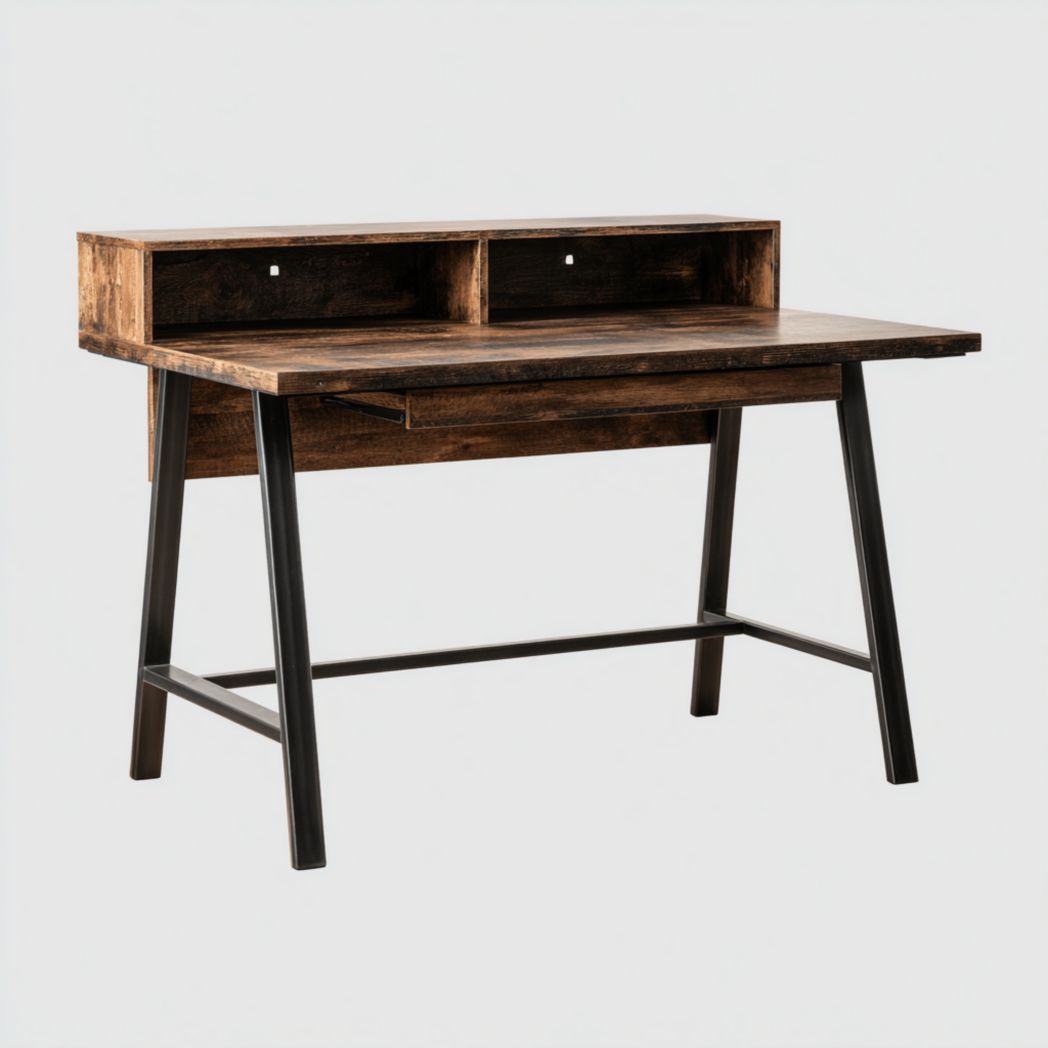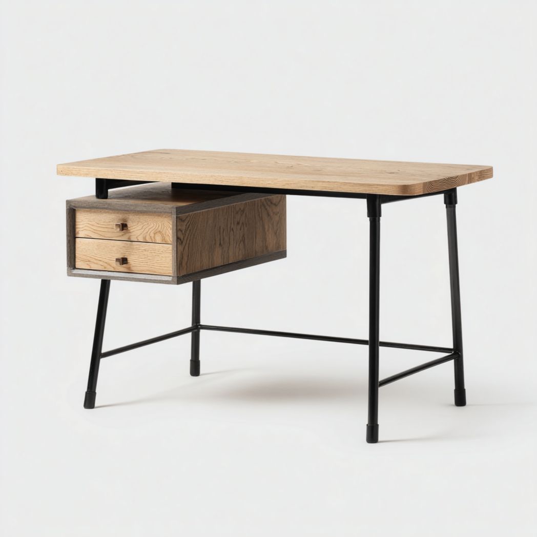 Bureau avec plateau en bois massif et structure en acier, avec tiroirs intégrés