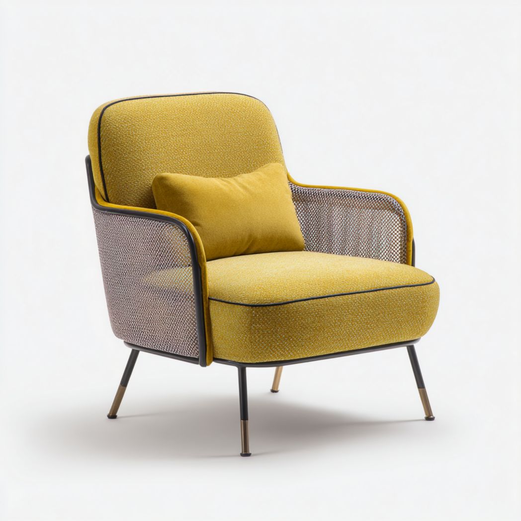 Fauteuil de Salon en Tissu Jaune Moutarde avec Accoudoirs en Rotin