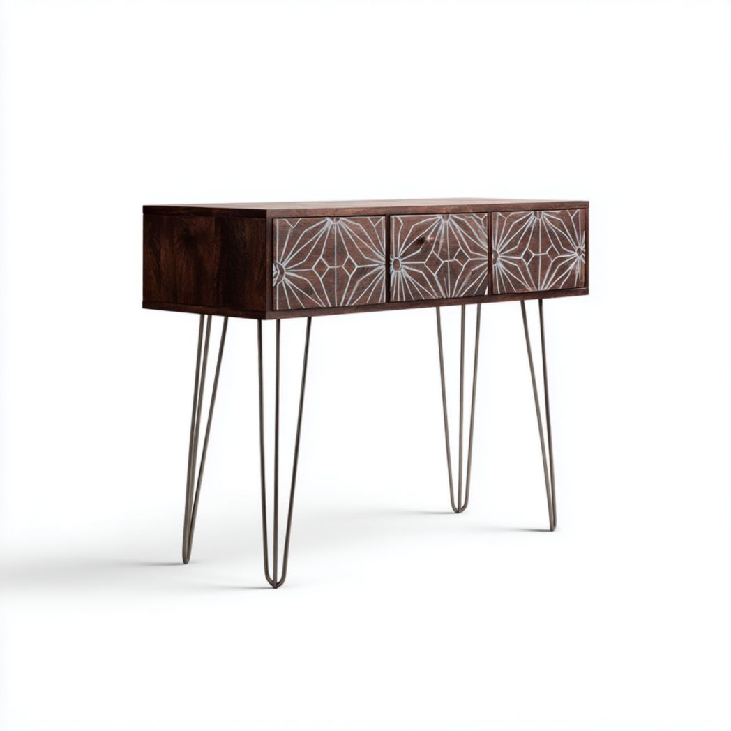 Console étroite 3 tiroirs en bois de manguier brun foncé avec pieds en acier