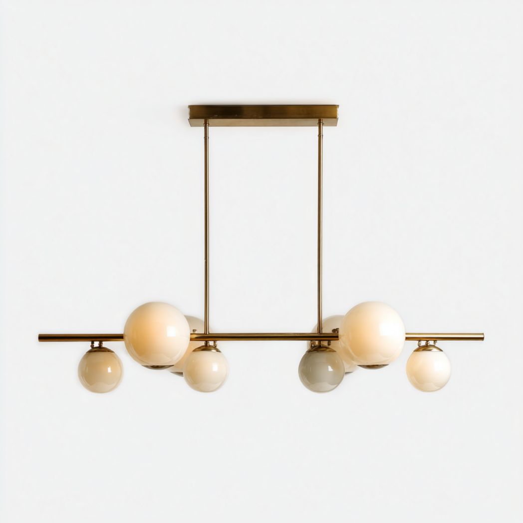 Matériaux : Globes en verre opalin, structure linéaire et éléments de suspension en acier avec finition laiton