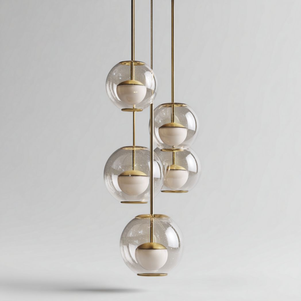 Matériaux : Globes en verre transparent, diffuseurs internes en verre opalin, structure et tiges de suspension en acier avec finition laiton